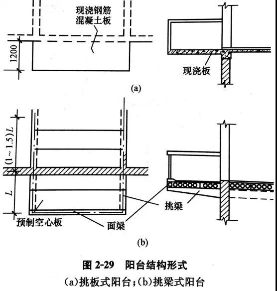 阳台形式很多,在使用方面,有生活阳台、服务阳台。生活阳台供生活起居之用,服务阳台为从事家务活动等用。而阳台结构形式有挑板式阳台和挑梁式阳台两种,见下图。