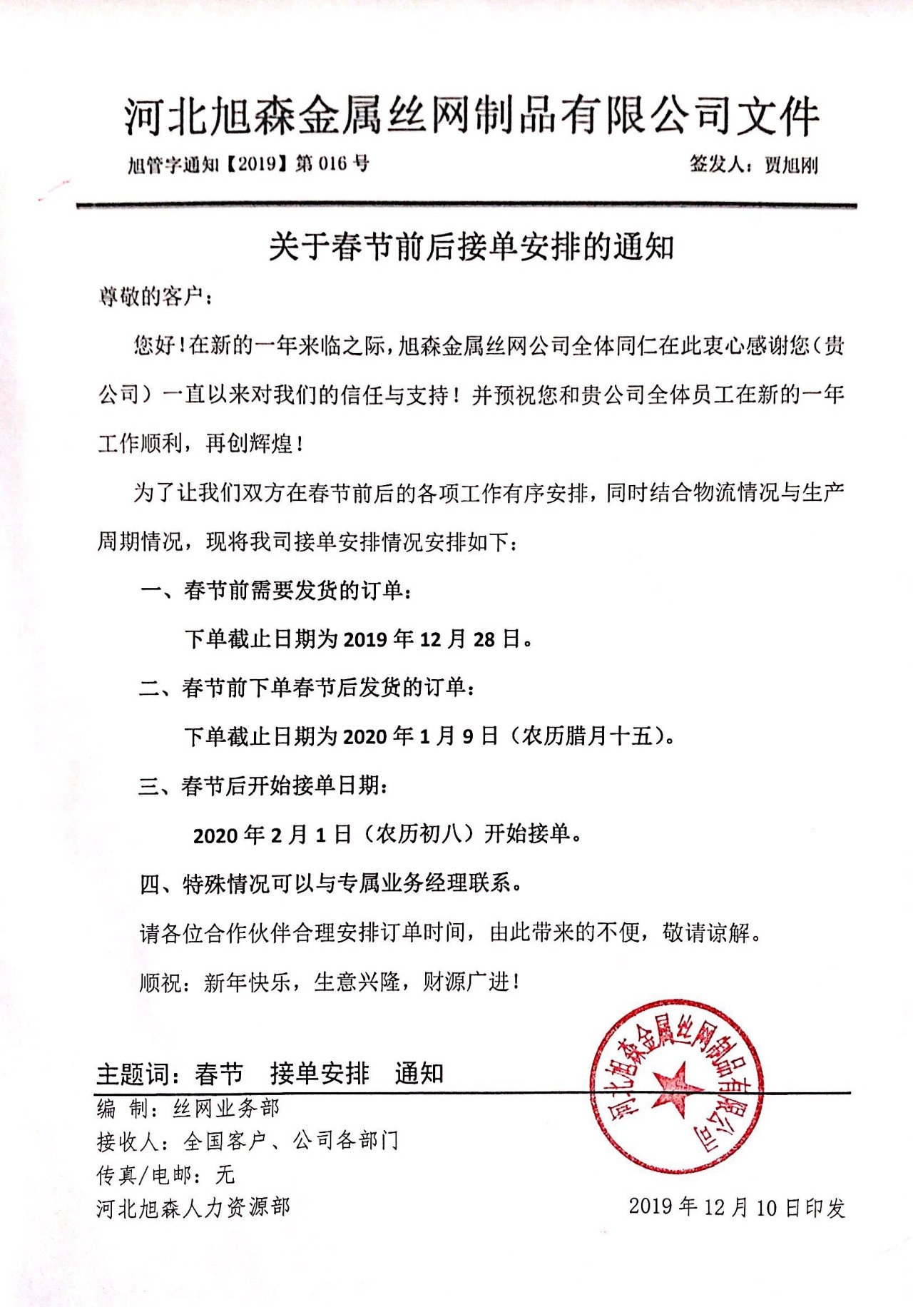 公告:旭森公司年底售后及接单安排通知!请各位客商安排下单时间